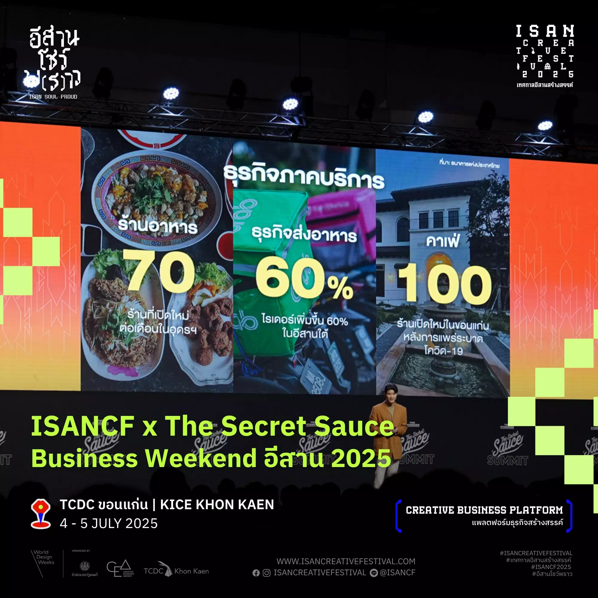 นี่ไม่ใช่แค่เวทีแสดงผลงาน แต่คือพื้นที่ที่ชวนคนอีสานกลับมาใช้ศักยภาพ ความรู้ และประสบการณ์ สร้างธุรกิจและเปลี่ยนแปลงเมืองของตัวเอง ผ่าน 3 อุตสาหกรรมสร้างสรรค์หลัก ได้แก่ อาหาร บันเทิงและคอนเทนต์ หัตถกรรม ศิลปะ และการออกแบบ