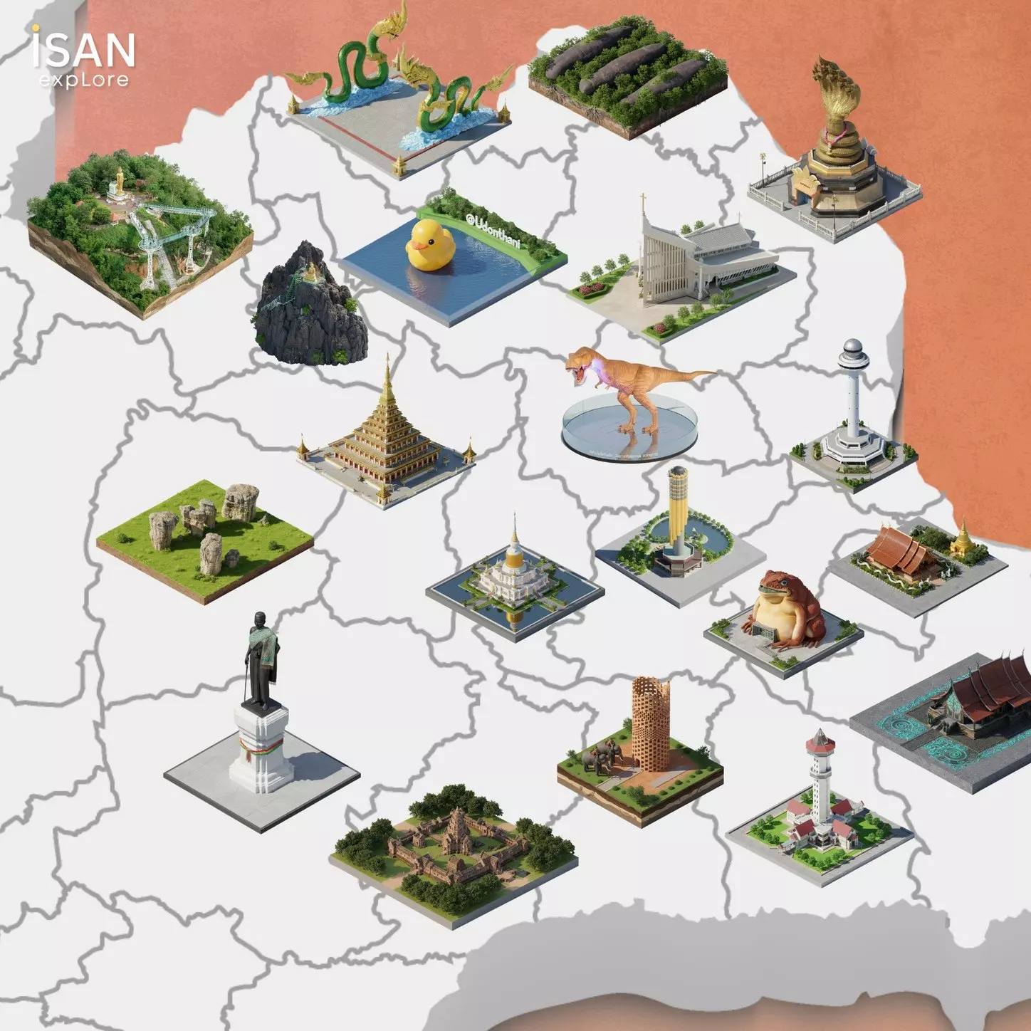 เรารวบรวมแลนด์มาร์คเด่นของแต่ละจังหวัดในภาคอีสาน ถ่ายทอดเป็นชิ้นงานเชิงออกแบบที่เห็นองค์ประกอบเมืองราวกับย่อส่วน ทั้งวัดสำคัญ อนุสาวรีย์ พิพิธภัณฑ์ แหล่งท่องเที่ยวธรรมชาติ ไปจนถึงสัญลักษณ์ร่วมสมัยของชุมชน
